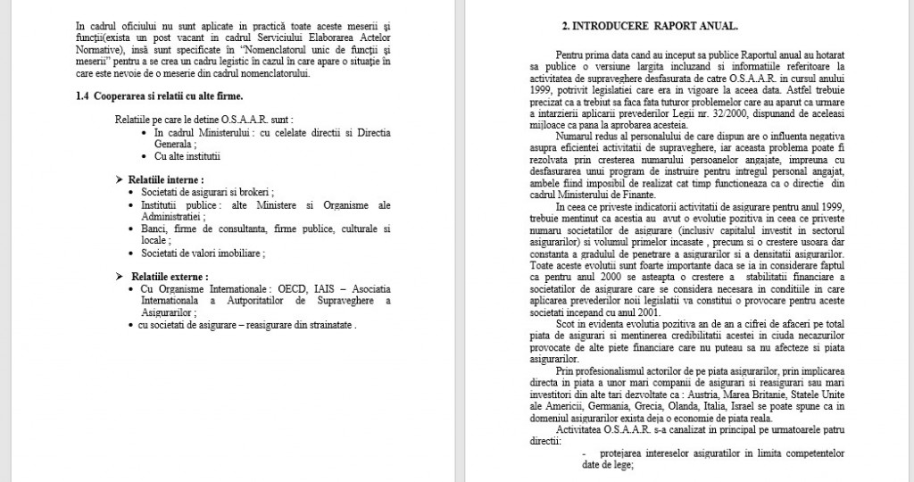 Pentru prima data cand au inceput sa publice Raportul anual au hotarat sa publice o versiune largita incluzand si informatiile referitoare la activitatea de supraveghere desfasurata de catre O.S.A.A.R. in cursul anului 1999, potrivit legislatiei care era in vigoare la aceea data. Astfel trebuie precizat ca a trebiut sa faca fata tuturor problemelor care au aparut ca urmare a intarzierii aplicarii prevederilor Legii nr. 32/2000, dispunand de aceleasi mijloace ca pana la aprobarea acesteia.