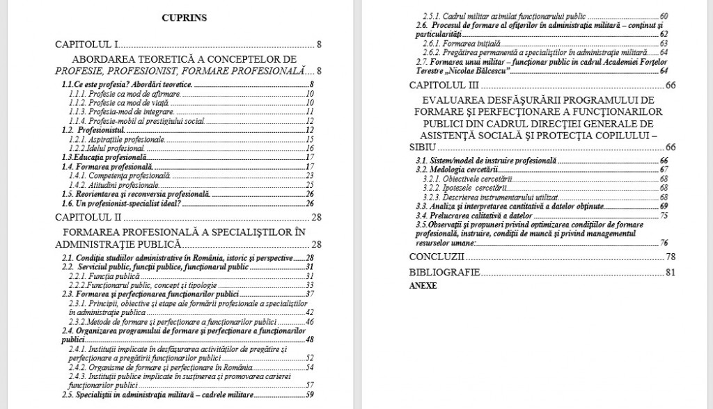 Lucrarea de faţă am structurat-o pe trei capitole. Primul capitol aduce în vederea cititorului concepte precum: profesionist, profesionalism, formare profesională, competenţă profesională, aptitudini profesionale, atitudini profesionale, ideal profesional, etc.. Prin abordarea acestora am urmărit crearea unei imagini a ceea ce ar însemna un tip ideal al profesionistului care să se plieze pe orice domeniu, inclusiv în administraţie publică. Am încercat să arătăm cum poate fi privită profesia ca şi un mod de viaţă; un mod de exprimare; un mod de valorizare prin toate aceste perspective nu se doreşte decât a se evidenţia faptul că acest proces de însuşire a unei profesiuni se desfăşoară pe etape de familiarizare, iniţiere, dobândire a competenţelor teoretice şi practice de bază în şcoli de nivel mediu şi superior, prin ucenicia la locul de muncă, prin instituţii extraşcolare (universităţii cultural-ştiinţifice) departamente de profesionalizare la distanţă. Diplomele şi certificatele confirmă profilul meseriei şi specializarea, tipul de instituţie formatoare şi nivelul performanţei la absolvire (note, calificative).