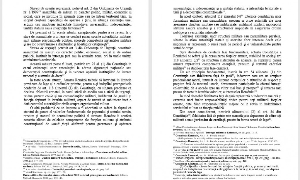 În considerarea tuturor acestor texte prevăzute în Constituţia României, actuala lege fundamentală, mult mai amplu decât celelalte legiuiri precedente, a făcut referiri la forţele armate şi responsabilităţile ce revin în special Armatei Române, în apărarea ţării, a poporului român şi a statului de drept.